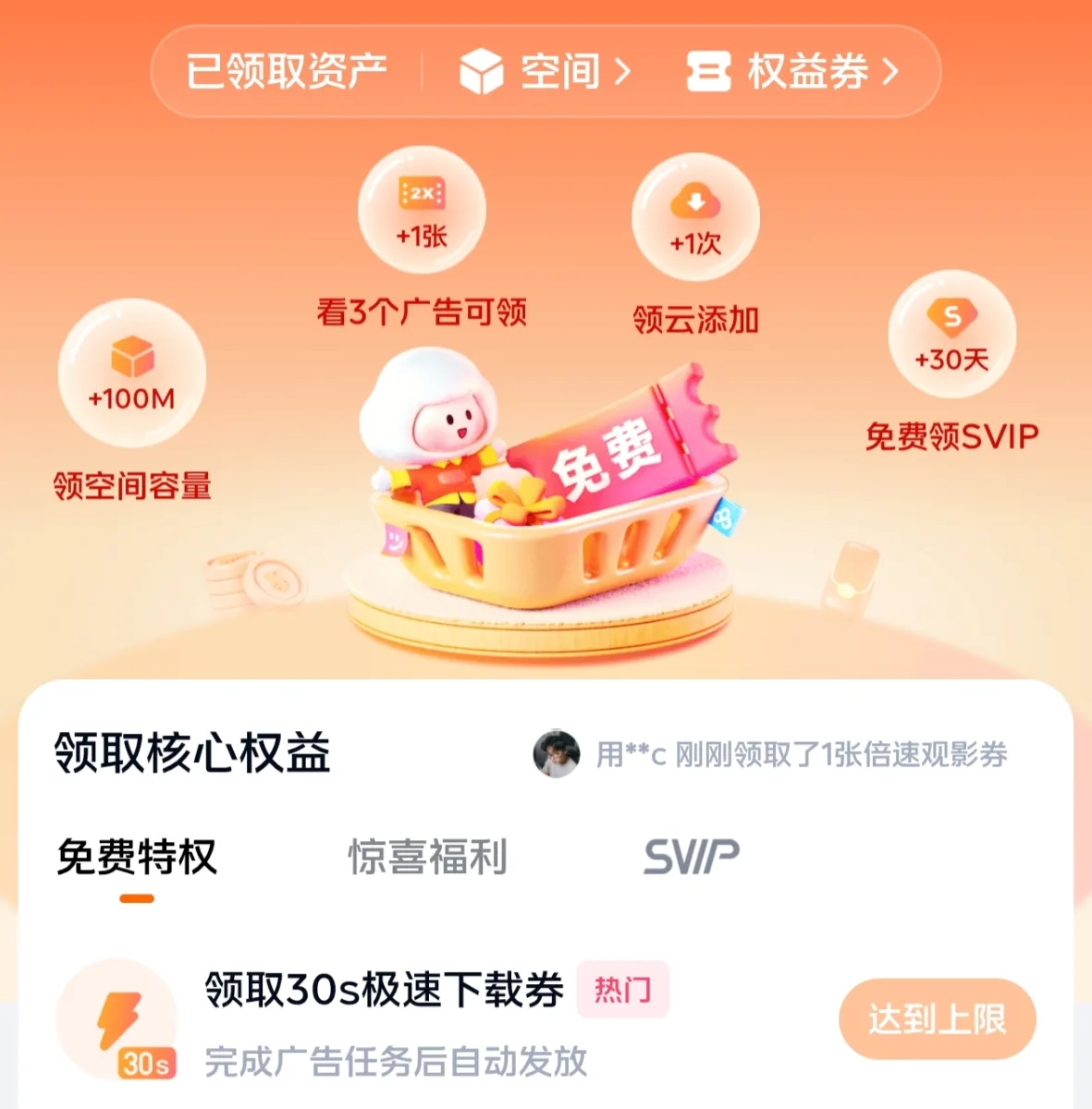 点击进去看广告任务,能得到60s的高速下载,每天能领两次,领取30s极速下载券。如图: