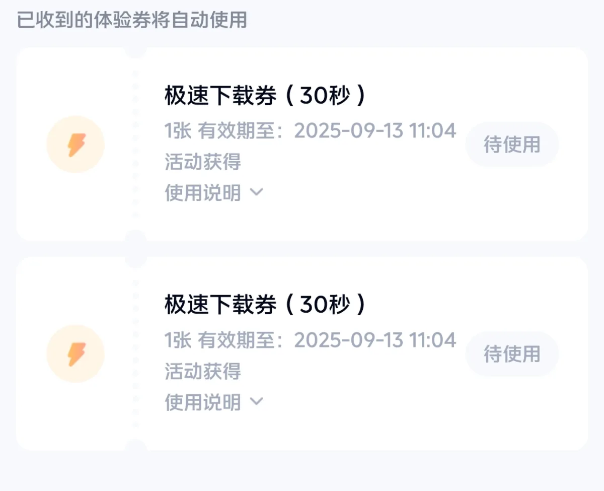 领到后,点击:已领取资产。就能看到我们领到的加速下载券,建议自己把网络调整好,比如连接稳定的WiFi或稳定的手机网络数据下载。这个下载加速券是可以跑满你的宽带网速跟数据网速,如果一分钟没有下载完成可以留第二天继续下载,一般在300M的数据网络和300M家庭带宽都能在60s内,稳定网络速度情况时,能下载完成1G-2G的大文件。