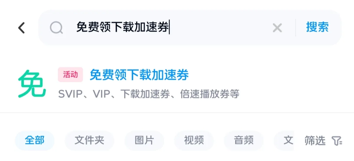 开始教学:打开百度网盘APP(我用的是安卓手机端的百度网盘做演示),在上面的搜索输入:免费领下载加速券。如图: